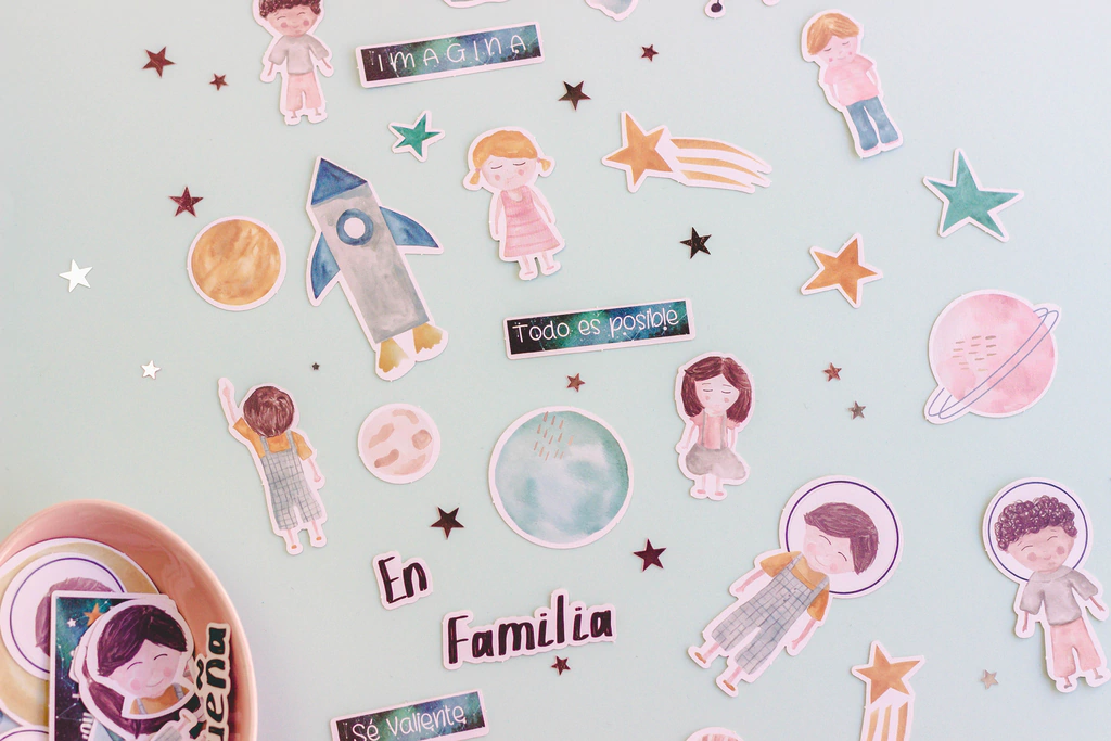 (2 hojas en formato 20×30 cm llenas de los distintos elementosde la colección: planetas, cohetes, niños, astronautas, estrellas, marcianitos, etc.)