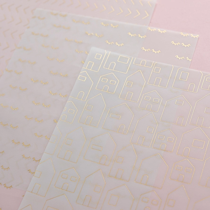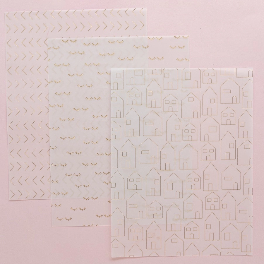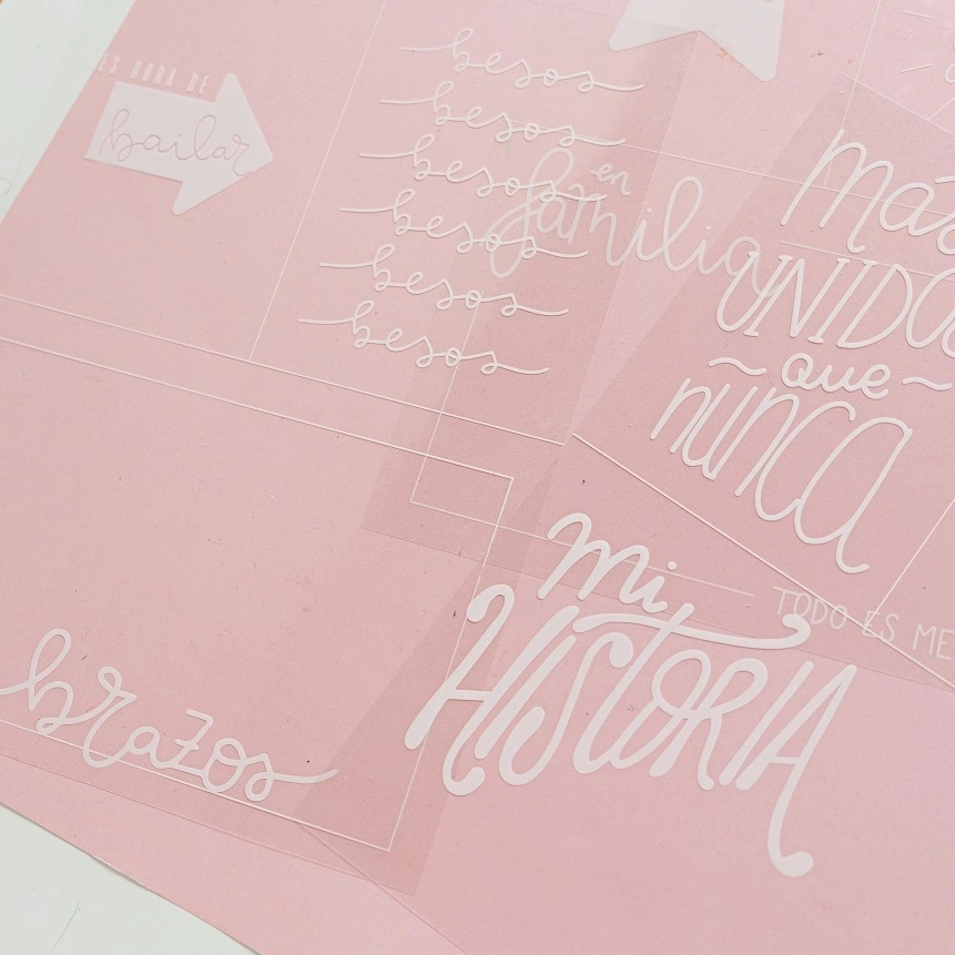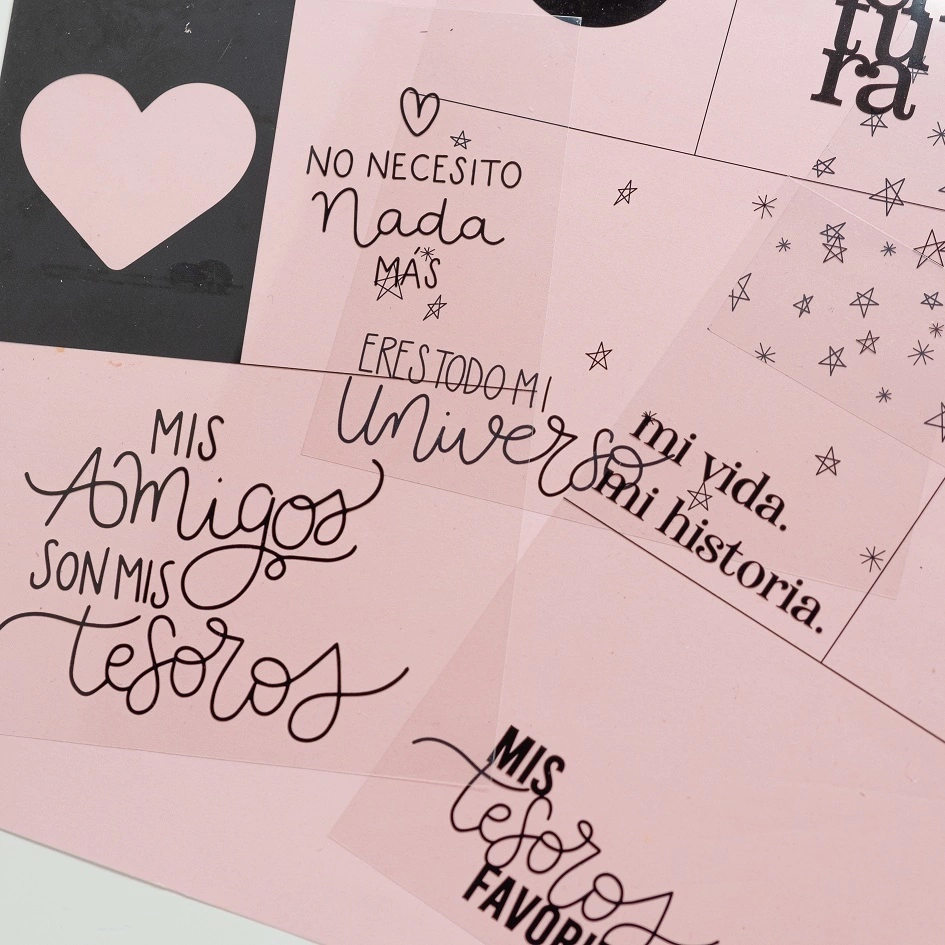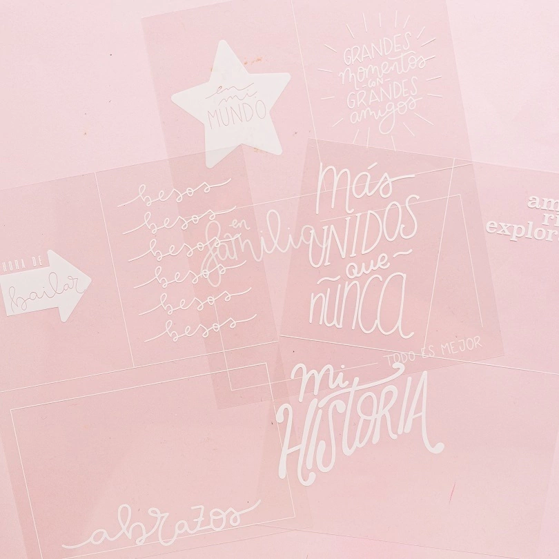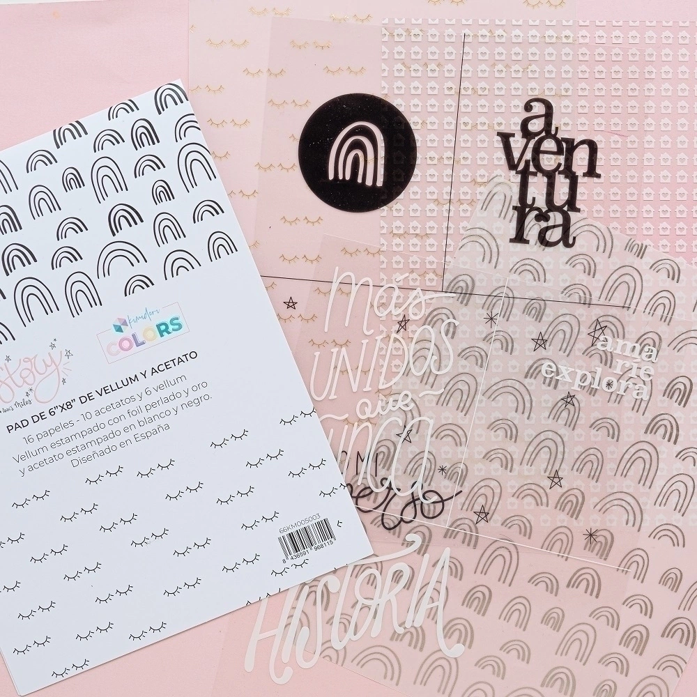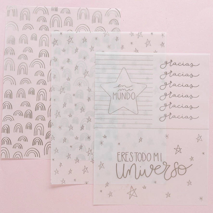 Cantidad: 6 vellums y 10 acetatos, algunos de ellos con tarjetas para recortar: 3 vellums estampados en dorado mate, 3 vellums estampados en color champagne perlado, 5 acetatos estampados en blanco, 5 acetatos estampados en negro.